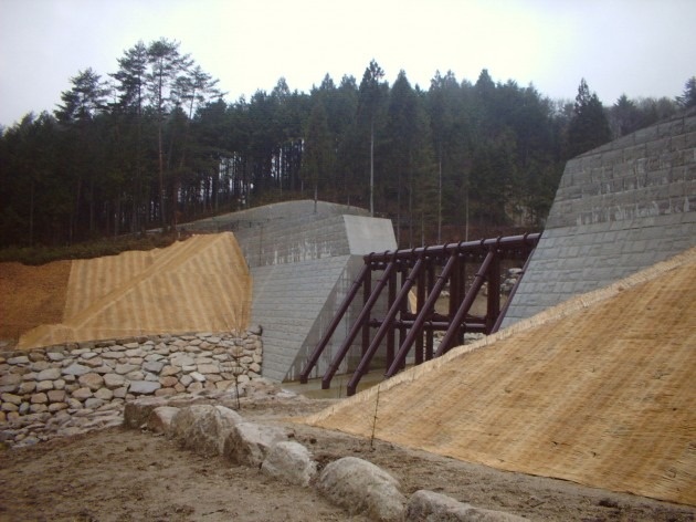 土石流と流木対策を目的とした砂防ダムです。スリット形式により動物の行動範囲を阻害しないよう配慮し、堰堤形式は発生残土を利用したソイルセメントで計画しました。生態系や環境にやさしい立案を得意としています。