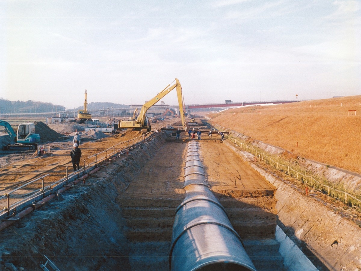 国営かんがい排水事業において幹線水路パイプラインの設計を実施しました。開水路の老朽化に起因する維持管理にかかる負担を軽減することを目的に、既設の開水路を撤去し、自然圧パイプラインにより管水路化することで安定した用水供給を確保することができました。