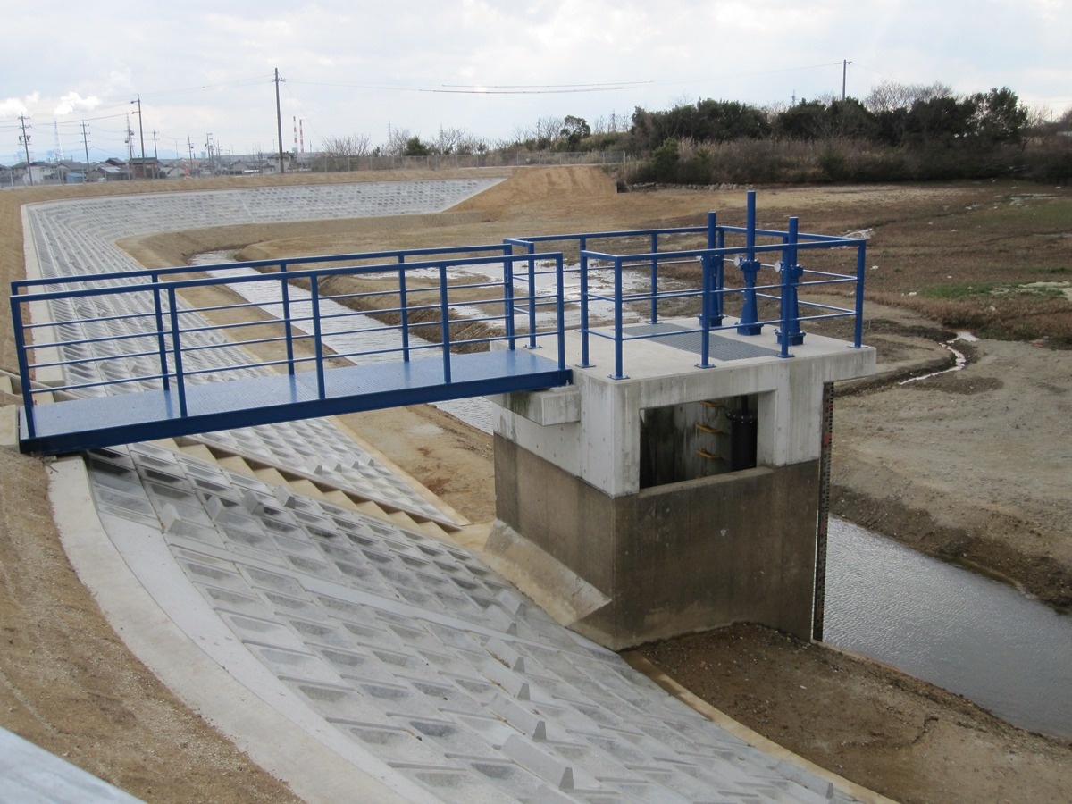 農地からの排水を河川へすみやかに放流させるとともに、川の水位が洪水などで高くなった時に、その水が農地等の堤内地側に逆流しないように設ける施設です。当社で蓄積された技術をベースにした排水シミュレーションと新技術を活用したきめ細かいサービスを提供しています。