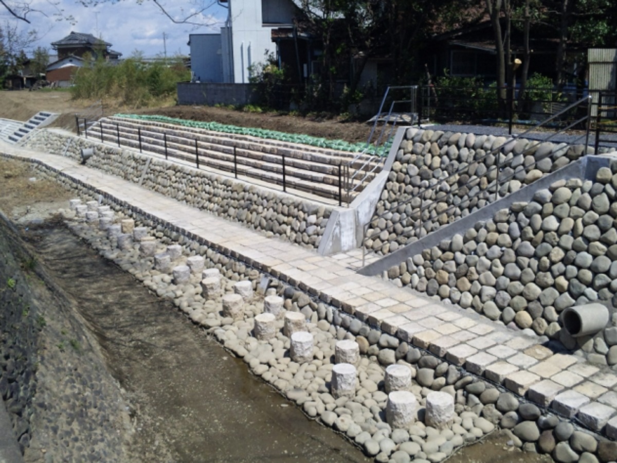 埼玉県最古の農業用水路(総延長は約23km)である備前渠用水路は1604年に開削され、本庄市、深谷市、熊谷市(旧妻沼町)の1,371ヘクタールの水田に用水を供給しています。水と緑の田園都市・水辺再生事業「備前渠用水路新井地区」の農業用水路の護岸について、地域住民や施設管理者の意向を反映し設計を実施しました。